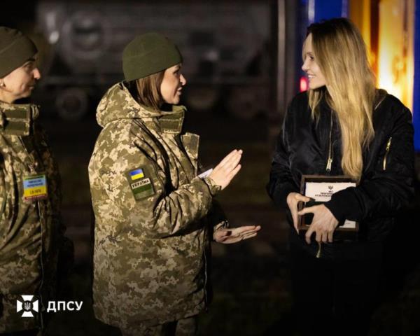 В благодарность пограничники вручили Анджелине Джоли символические подарки: набор национальной символики Украины и коин Государственной пограничной службы Украины.