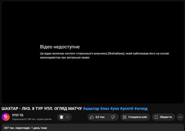 У системному повідомленні зазначено, що контент Екстракляси (Ekstraklasa) — польської футбольної ліги — був виявлений у відео від УПЛ ТБ, і саме ця організація ініціювала блокування згідно із законодавством про авторське право.