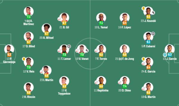 У стартовому складі каталонців вийшли українці Владислав Ванат та Віктор Циганков. Ванат провів на полі 73 хвилини та відзначився результативною передачею, ставши одним із найкращих гравців матчу. За оцінкою статистичного порталу SofaScore він отримав 7.5 бала. Віктор Циганков, який відіграв повний матч, був оцінений у 6.9–7.0 бала різними аналітичними платформами, віддавши два ключові паси та здійснивши одну вдалу спробу обіграшу.