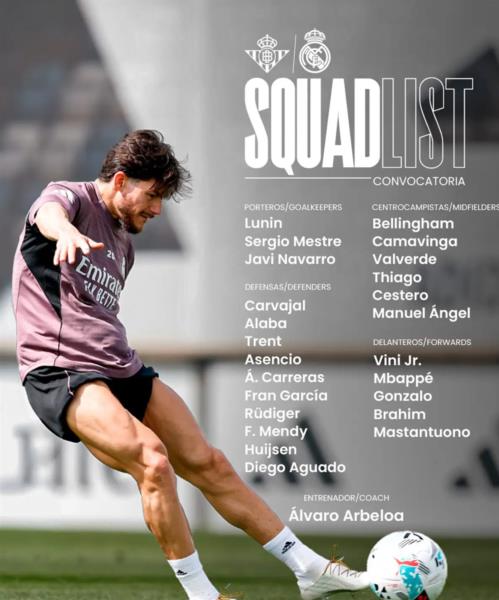 Головний тренер "вершкових" Альваро Арбелоа визначився зі списком гравців, які будуть доступні у сьогоднішній грі.