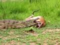 Участник сафари в кенийском национальном парке Масаи-Мара снял на видео спасение антилопы-импалы из челюстей крокодила. Ролик начинается уже после нападения рептилии на импалу. Хищник держит лежащую антилопу за заднюю лапу и терпеливо ждет. Импала восполь...