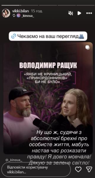 «Ну что ж, судя по абсолютной лжи, пожалуй, пришло время рассказать правду! Я долго молчала! Спасибо за зеленый свет! », — прокомментировала Билан-Ращук.