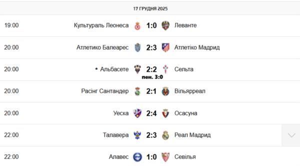 РЕЗУЛЬТАТИ МАТЧІВ 1/16 ФІНАЛУ КУБКА ІСПАНІЇ ЗА 17 ГРУДНЯ: