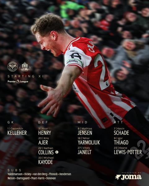 Брентфорд: Келлегер — Кайоде, Аєр, Коллінз, Генрі — Ярмолюк, Янельт — Єнсен, -, Шаде — Тьяго Запасні: Валдімарссон, Гікі,