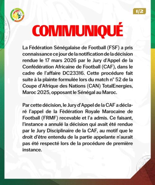 "Федерація футболу Сенегалу сьогодні отримала повідомлення про рішення, ухвалене 17 березня 2026 року Апеляційним комітетом Конфедерації африканського футболу у справі DC23316. Це провадження було ініційоване після подання скарги під час матчу №52 Кубка африканських націй у Марокко-2025 між збірними Сенегалу та Марокко.